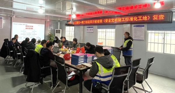 在驗收組專家對此次檢查驗收的程序、原則及人員分工等有關事宜進行說明後,檢查組按照《四川省省級安全生産文明施工标準化工地評審辦法》對項目進行了資料審查和現場檢查。驗收組專家一行在項目經理趙小剛同志、安全環保負責人陳劍同志及各施工管理人員的陪同下到達施工現場進行檢查驗收工作。驗收組一行逐一查看了施工現場質量、安全、文明施工管理、安全防護、現場清潔等建設情況,随後,驗收組一行在項目部會議室仔細審查了内業資料、聽取創标情況彙報、對項目綜合情況進行審核考評後召開檢查驗收會議。